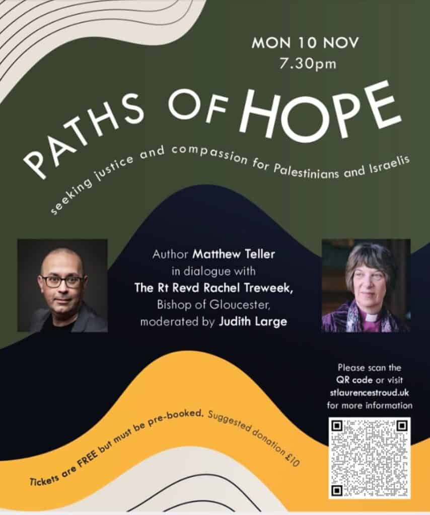 The Bishop of Gloucester, The Rt Revd Rachel Treweek, will be one of the speakers at an event focusing on the situation in Israel-Palestine in St Laurence Church in Stroud, at 7.30 pm on Monday 10th November. She will be in dialogue with the author Matthew Teller, moderated by Judith Large.